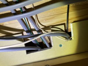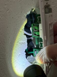 電気工事の配線の接続部分で分岐ボックスの未使用や断熱材に実線を埋め込んでいるなど不備が多数
